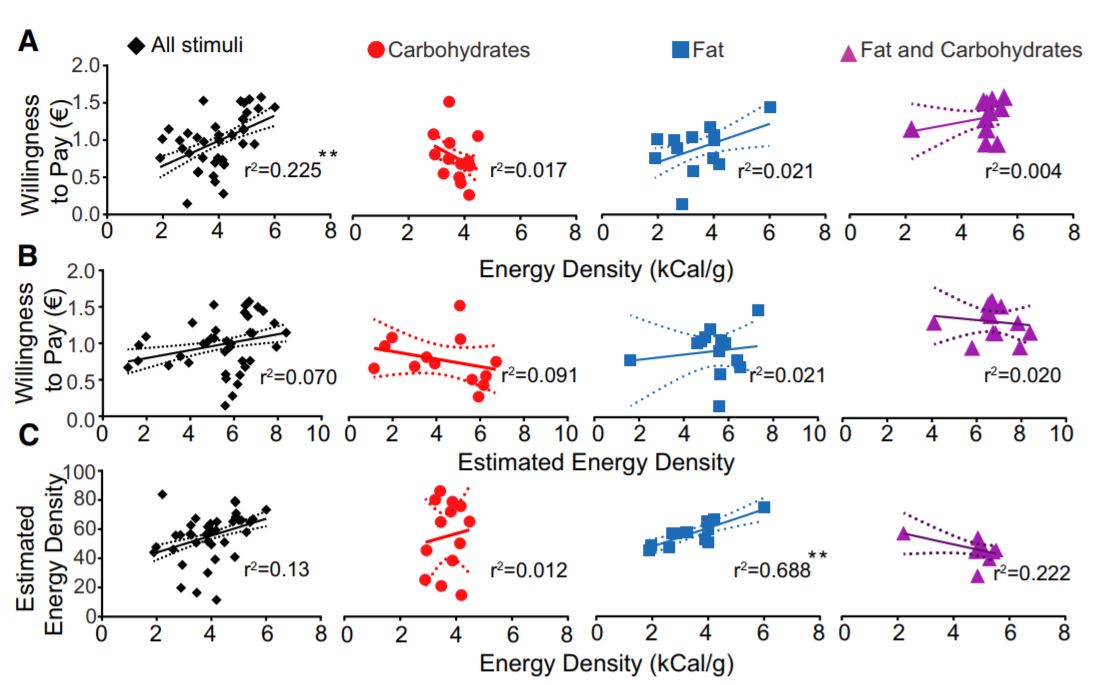 This data suggests that the association between food as a reward and food as an energy dense option will differ for fat and carbohydrate (Figure 2). For fatty foods, our willingness to pay is tightly coupled to energy density and self-reported "food liking". Although both food liking and energy density are associated with willingness to pay, mediation analyses indicate that these factors contribute independently to reward value.[1]